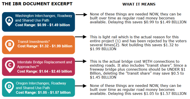 The key to an affordable, toll free, bridge is to build ONLY WHAT is needed now and leave the rest until it is actually needed, instead of trying to build everything at once.  One  IBR document shows the costs of each major part of the project: the Washington road projects, the Oregon Road Projects, the Bridge itself and the transit portion (presumably light rail). The key part of his single page document is shown below, and the document is https://www.interstatebridge.org/media/zxolv2lp/ibr-cost-graphic-remediated.pdf